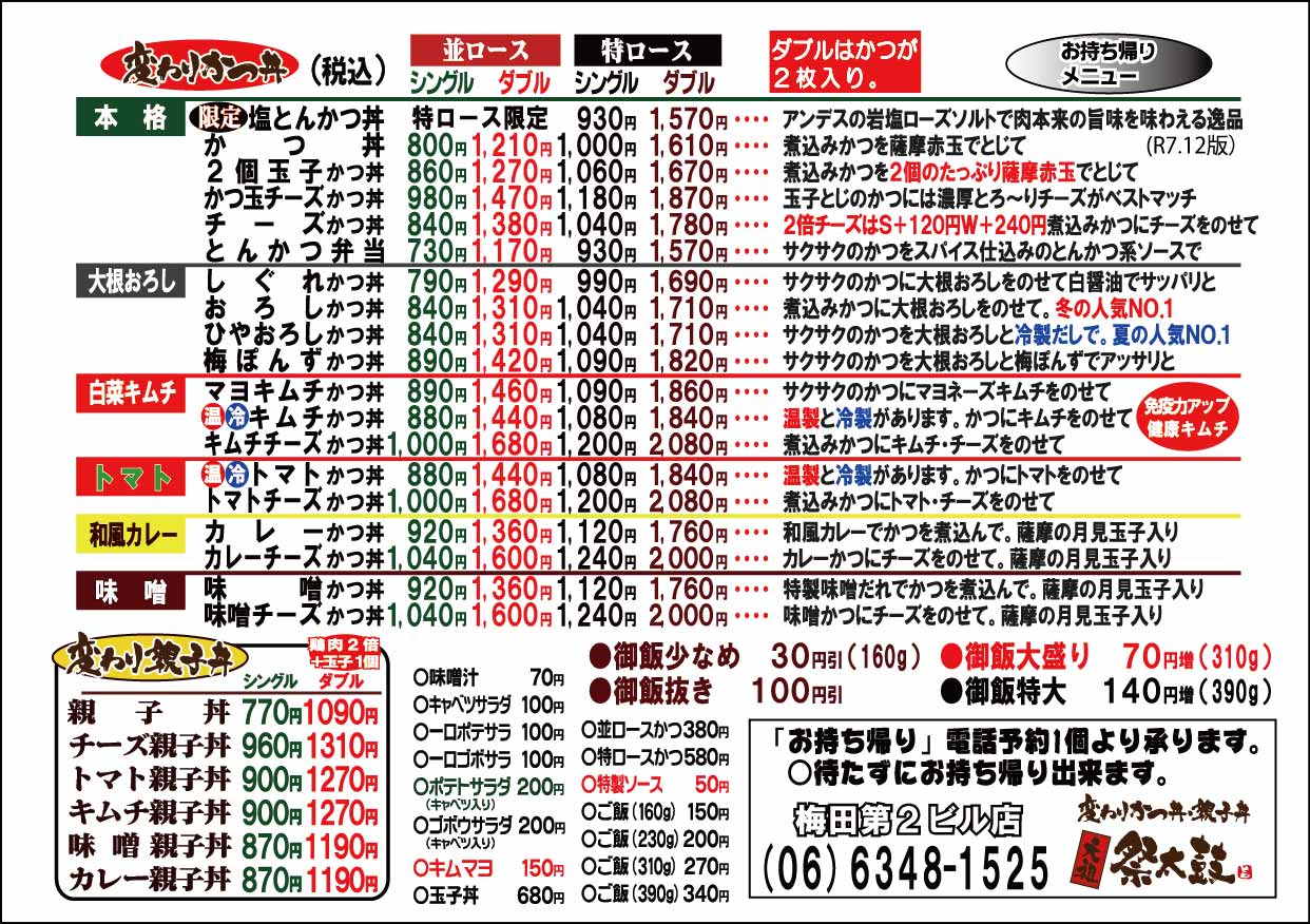 ○キムチかつ丼○ひやキムチかつ丼○キムチチーズかつ丼○味噌かつ丼○味噌チーズかつ丼○味噌親子丼○キムチ親子丼